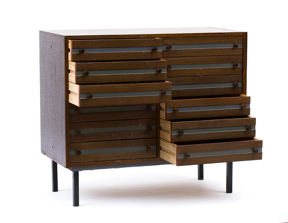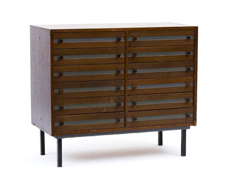MANIFATTURA SVEDESE Cassettiera, anni ‘60 Struttura a 12 cassetti in legno di...