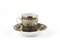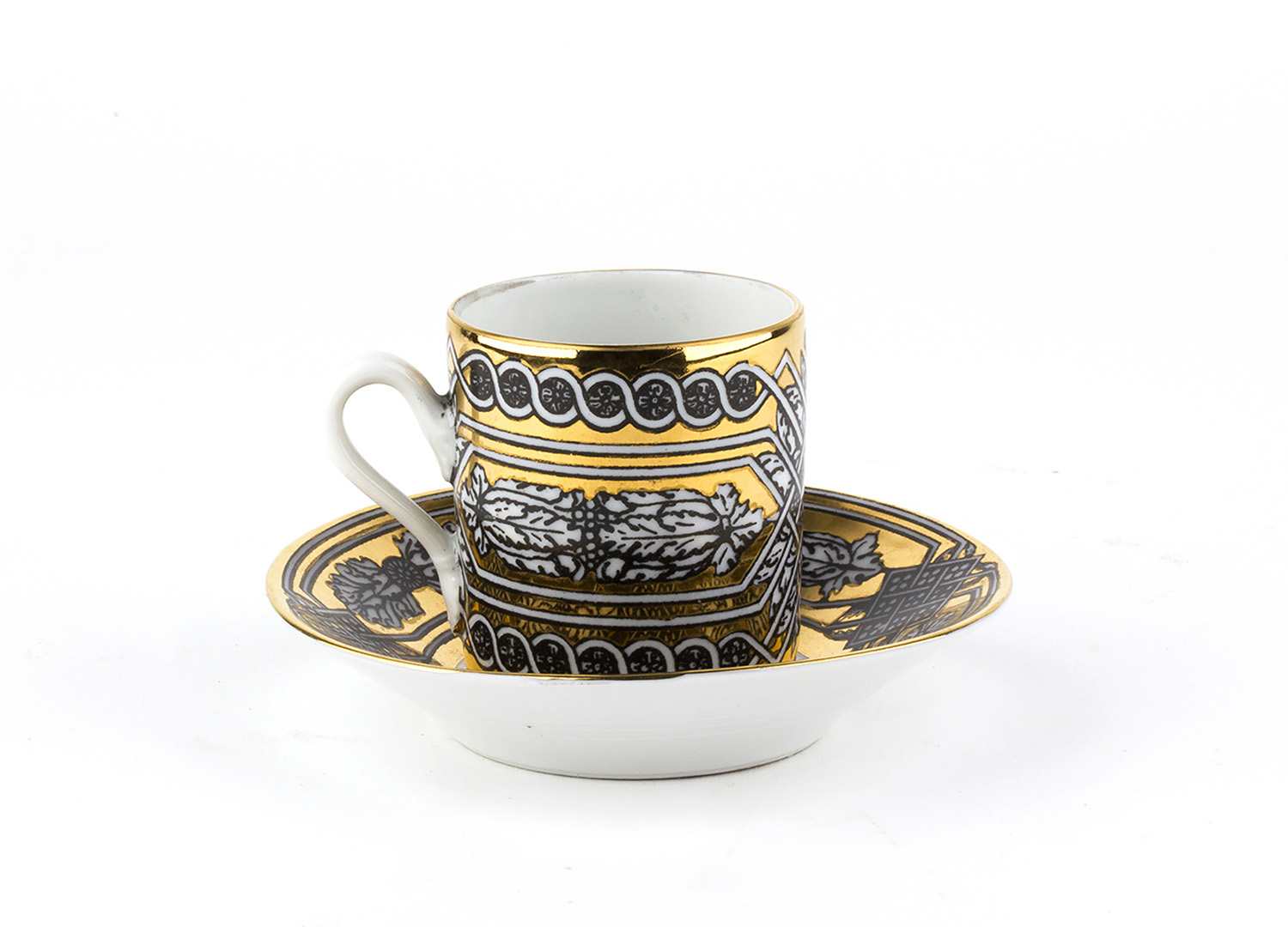 PIERO FORNASETTi Tazzina con piattino della serie “Greca” Porcellana decorata in nero ed oro, h. 5,5, d. 10,5 cm (rispettivamente) Marchio e luogo inscritti sotto la base del pattino: Greca, marchio Fornasetti, Milano made in Italy, R Marchio di fabbrica sotto alla tazzina
