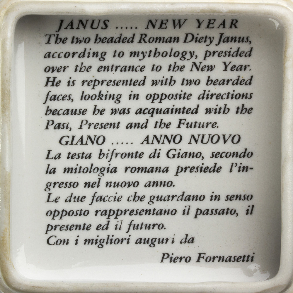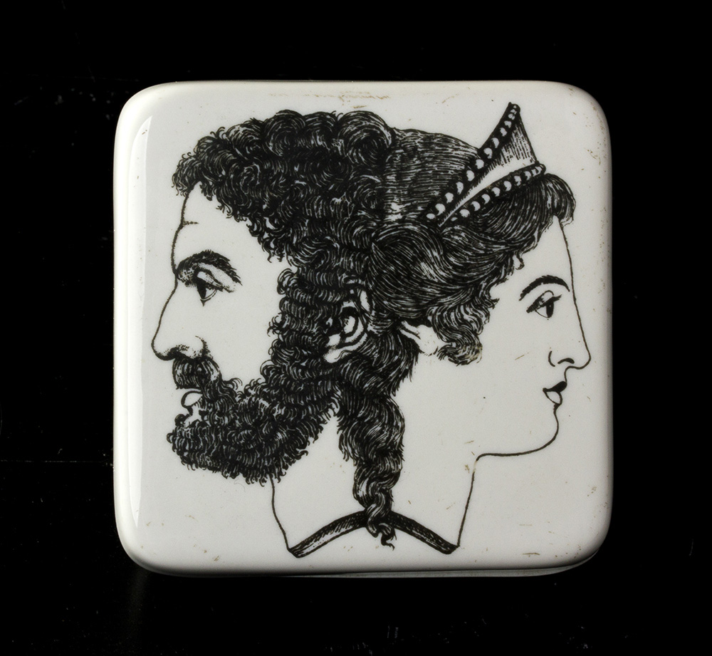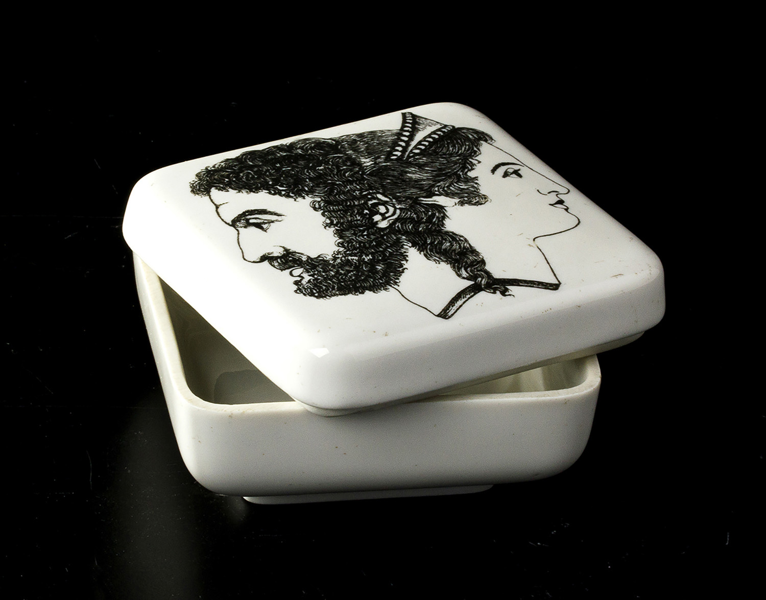 PIERO FORNASETTI Scatola “GIANO” Porcellana decorata in monocromia nera, 4 x 7 x 7 cm Scritta in inglese e in italiano firmata Piero Fornasetti sotto al coperchio