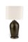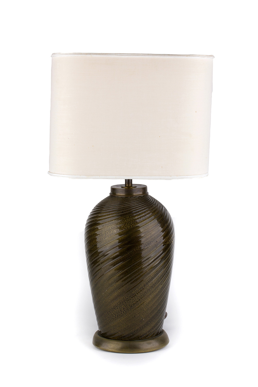 TOMMASO BARBI Lampada, anni ’70 Base in vetro sommerso nero costolato con spruzzature d’oro, diffusore a ventola in stoffa h. 57 cm (complessivo), 40 cm (senza diffusore) Etichetta sotto la base: Tommaso Barbi Roma made in Italy