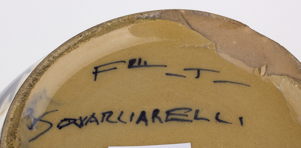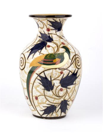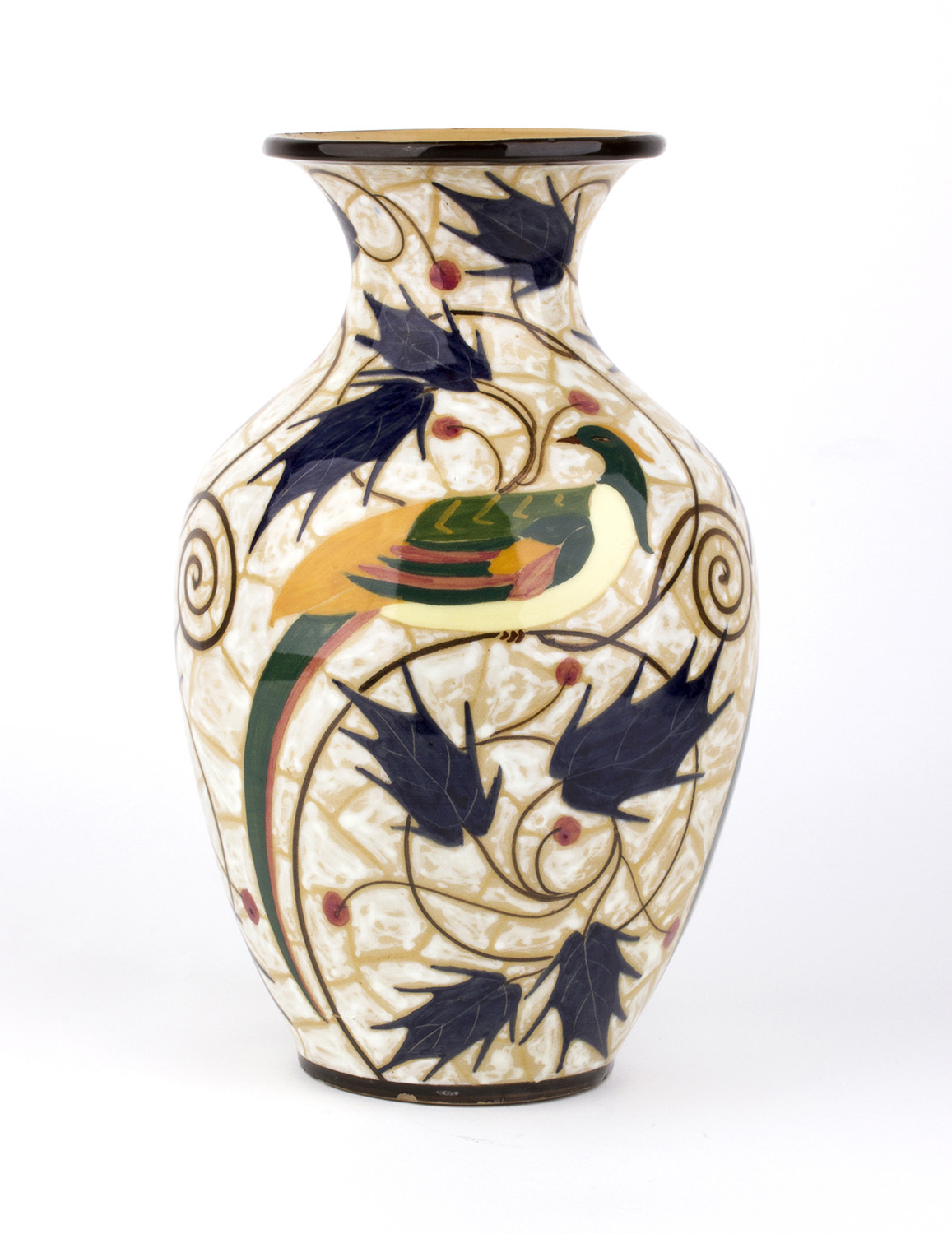 FRATELLI TIDEI - SQUARCIARELLI Vaso con uccello del paradiso su fondo a girali di agrifoglio, Anni ‘20/’30 Terracotta dipinta a policromia e invetriata, h. 30 cm Marchio della manifattura sotto la base: F.LLI T./ SQUARCIARELLI Il fondo a ingobbio è tipico della ceramica di Squarciarelli, così come il motivo dell’agrifoglio stilizzato di un blu intenso e brillante. Un esemplare analogo, di forma diversa e decorato solo con l’agrifoglio, è pubblicato in: Irene de Guttry, M.P.Maino, Artisti e fornaci. La felice stagione della ceramica a Roma e nel Lazio (1880-1930), Roma 2003, p.112 n.141