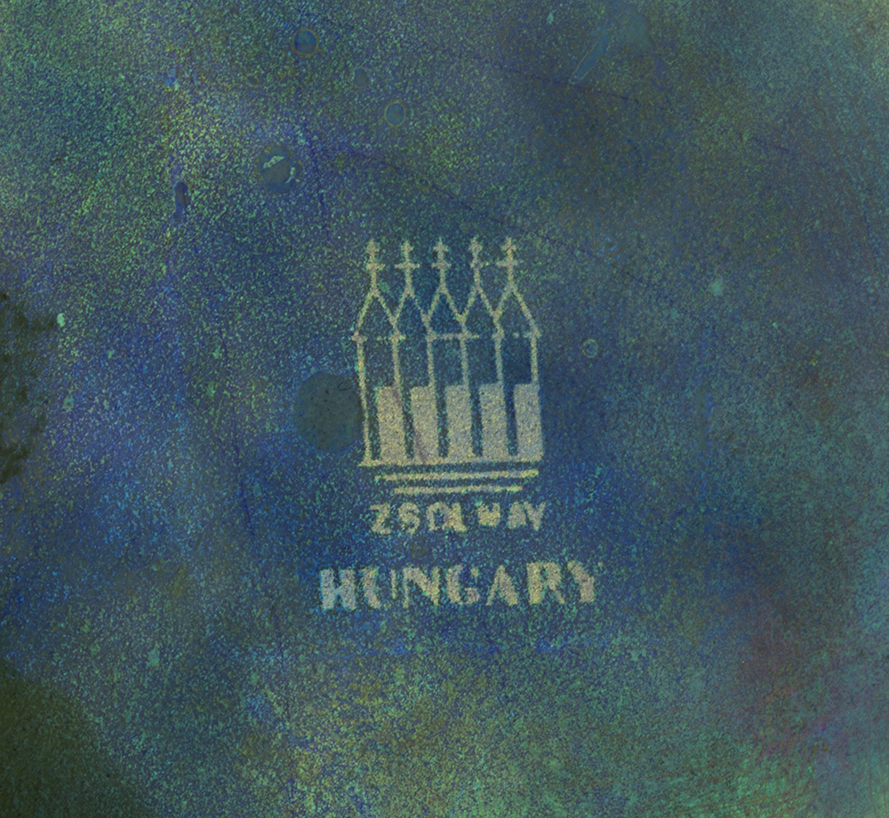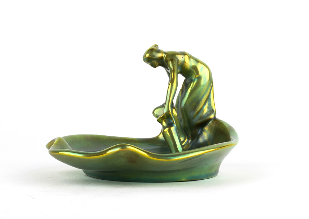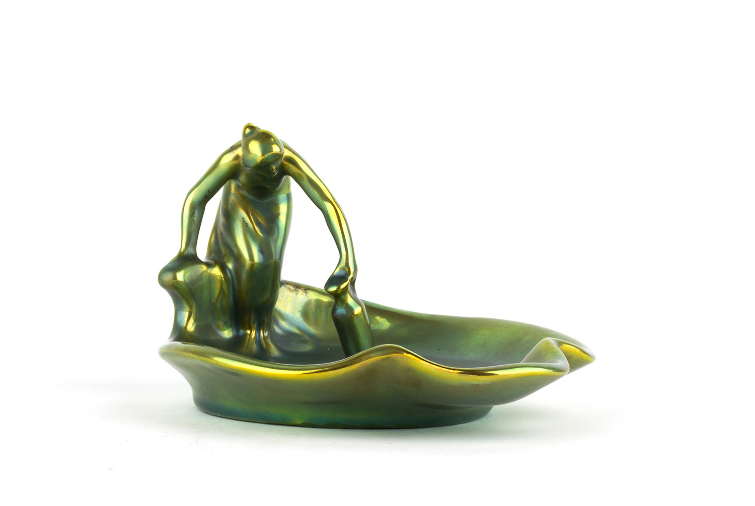 ZSOLNAY Vaschetta vuotatasche con donnina, 1900 circa Scultura in terracotta smaltata a lustro, 10 x 16,5 x 14 cm Marchio e luogo sotto la base: Zsolnay Hungary