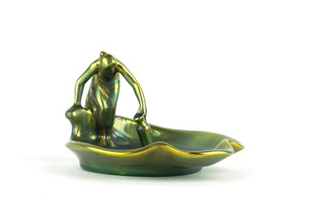 ZSOLNAY Vaschetta vuotatasche con donnina, 1900 circa Scultura in terracotta...