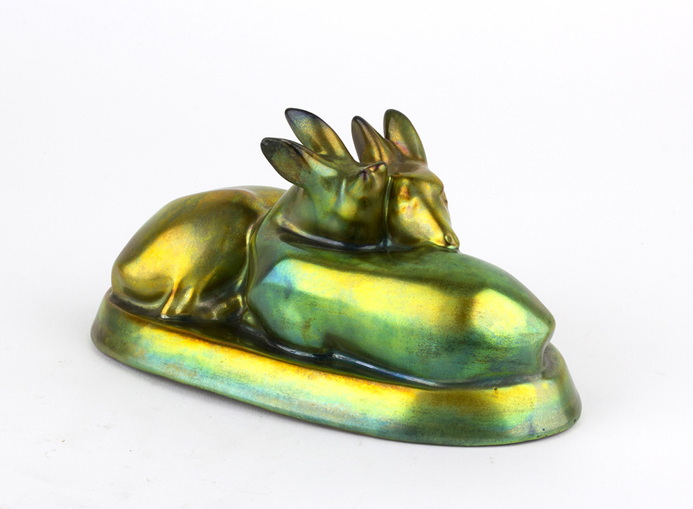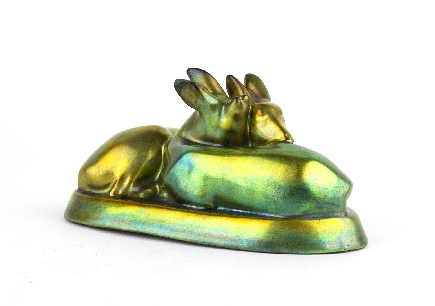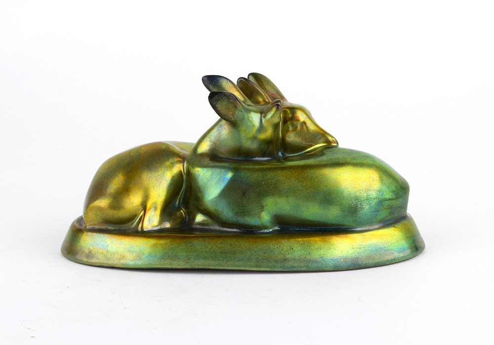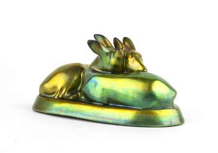 ZSOLNAY Cerbiatti, 1900 circa Scultura in terracotta smaltata a lustro, 8 x...