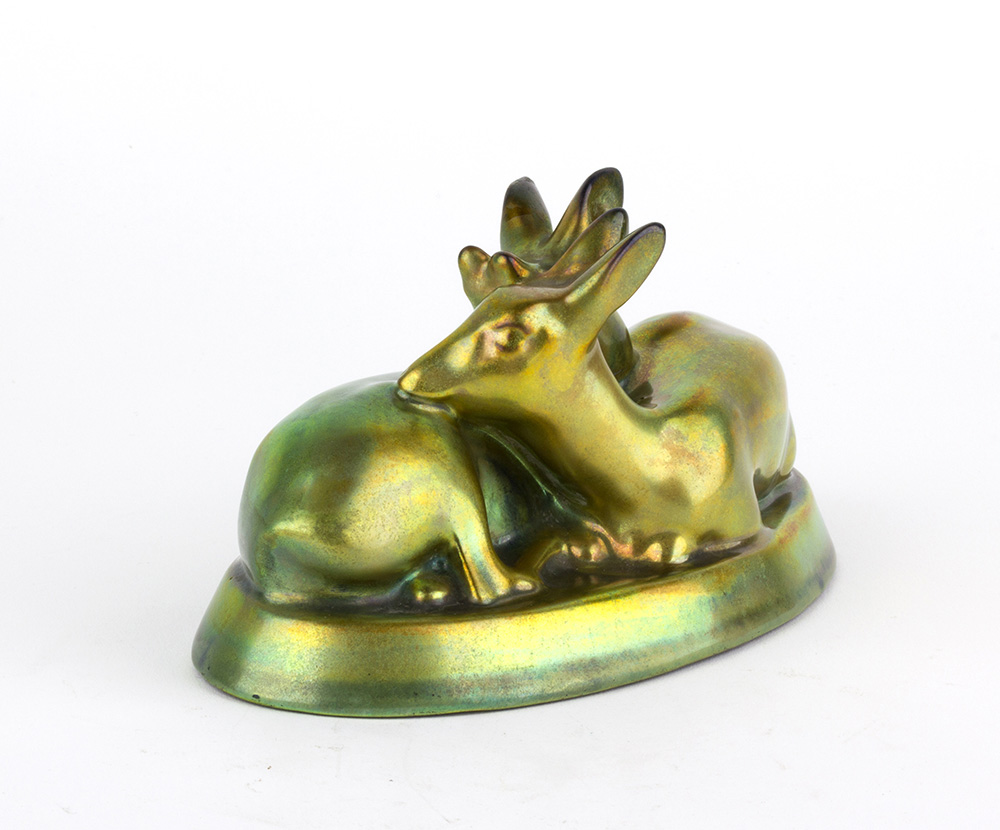ZSOLNAY Cerbiatti, 1900 circa Scultura in terracotta smaltata a lustro, 8 x 15 x 8 cm Marchio sotto la base: Zsolnay Pècs made in Hungary