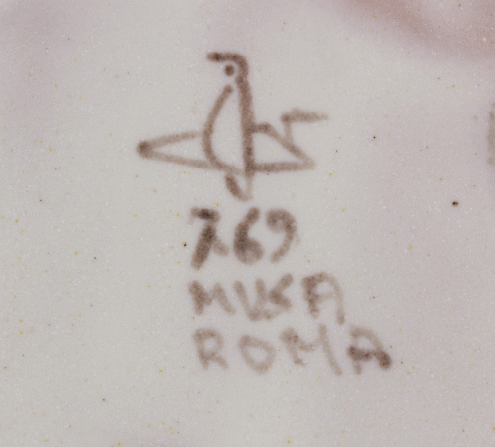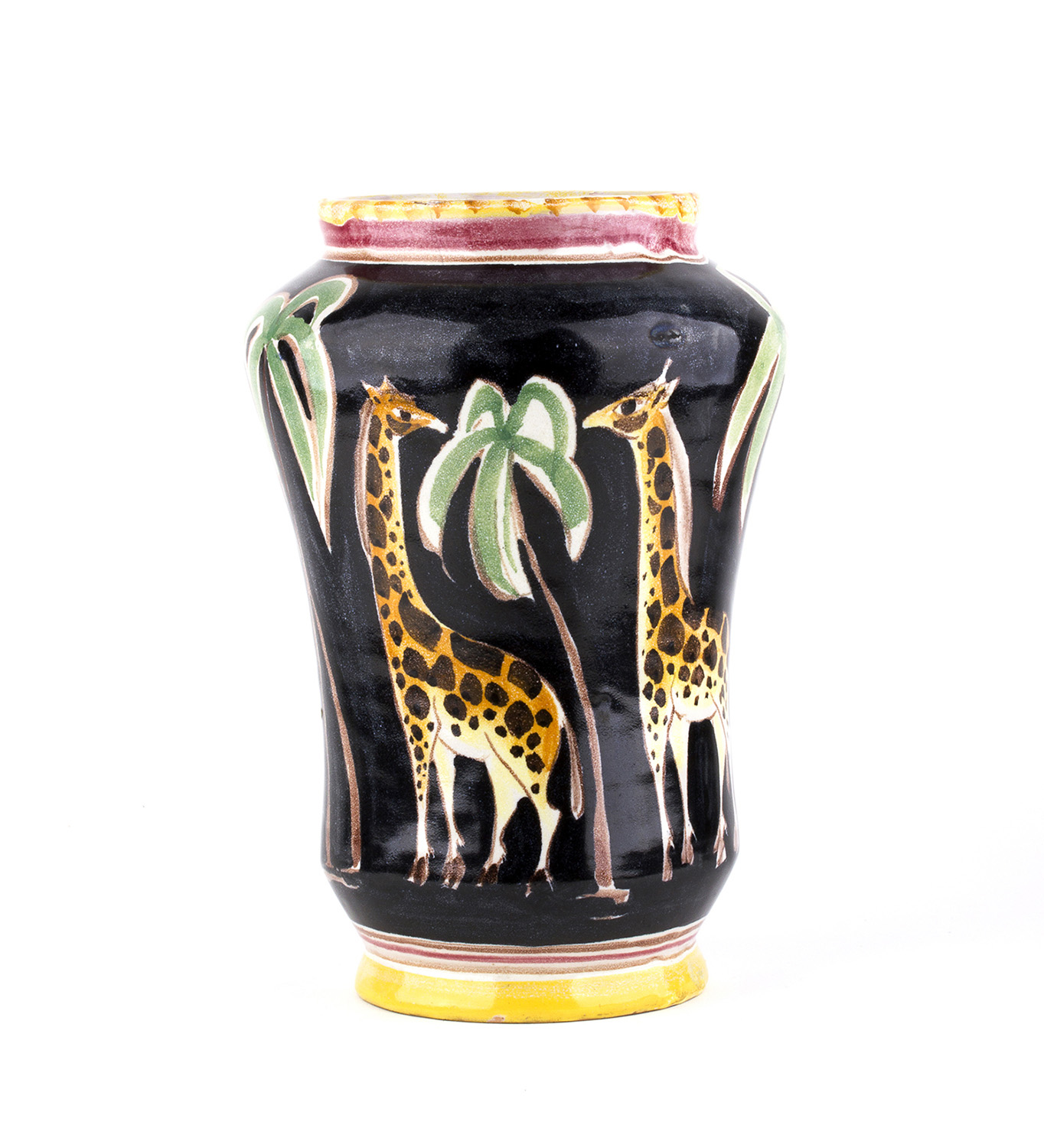 MUSA - ROMA Vaso con giraffe e palme, anni ‘40 Terracotta dipinta a policromia e invetriata, 27 x 19 x 19 cm Marchio sotto la base: Musa Roma e simbolo grafico