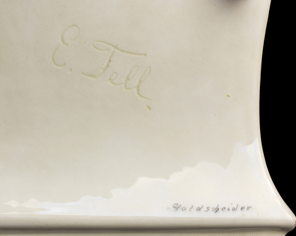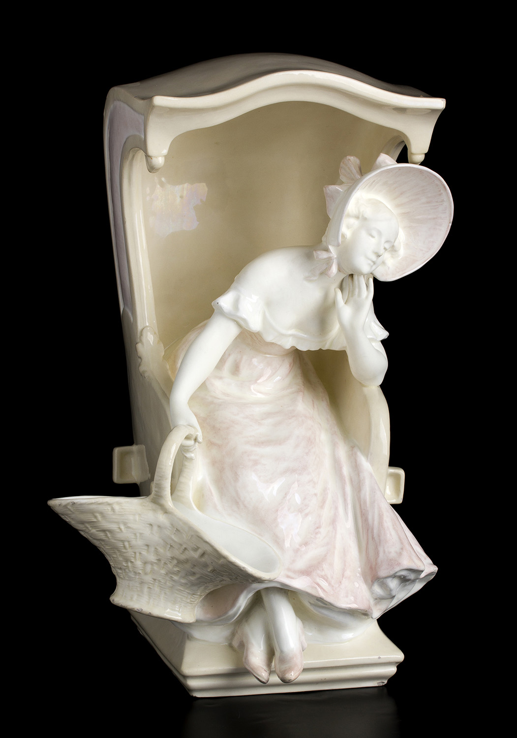 GOLDSCHEIDER - VIENNA Figura femminile liberty seduta su portantina, 1900 circa Ceramica smaltata bianca e rosa, 39 x 24 x 24 cm Firma incisa sul lato sinistro: E. Tell Firma scritta sottovetrina: Goldscheider Marchio incusso sul retro: Friederich Goldscheider Wien Reproduction Reservée