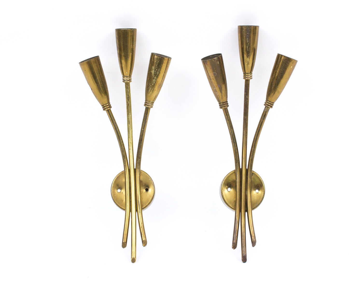 MANIFATTURA ITALIANA Coppia di appliques a tre luci, anni ‘50 Ottone, h. 35