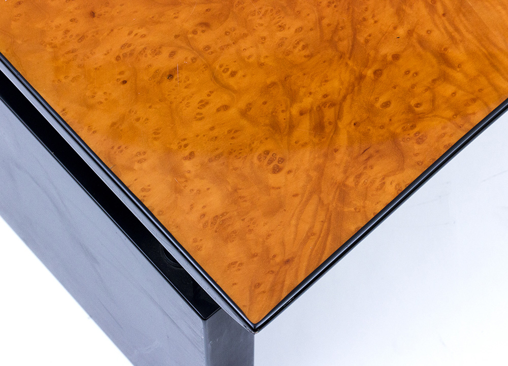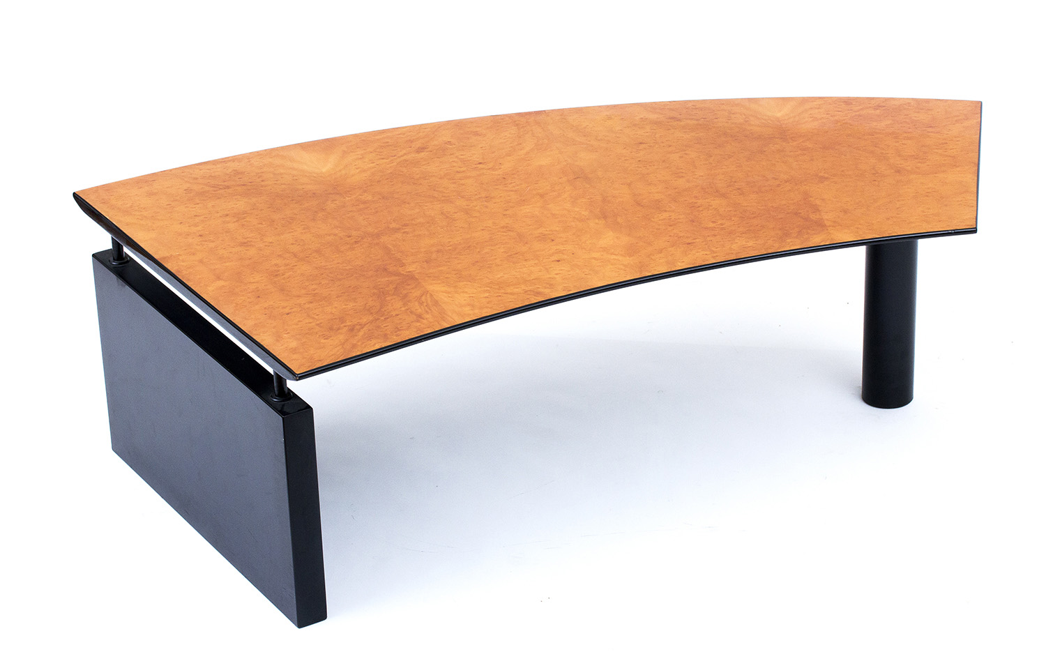 CATTELAN ITALIA Tavolo basso a mezzaluna, 1970-1980 Supporti in legno ebanizzato lucido, piano in radica di tuia vetrificata, 41,5 x 134 x 71 cm
