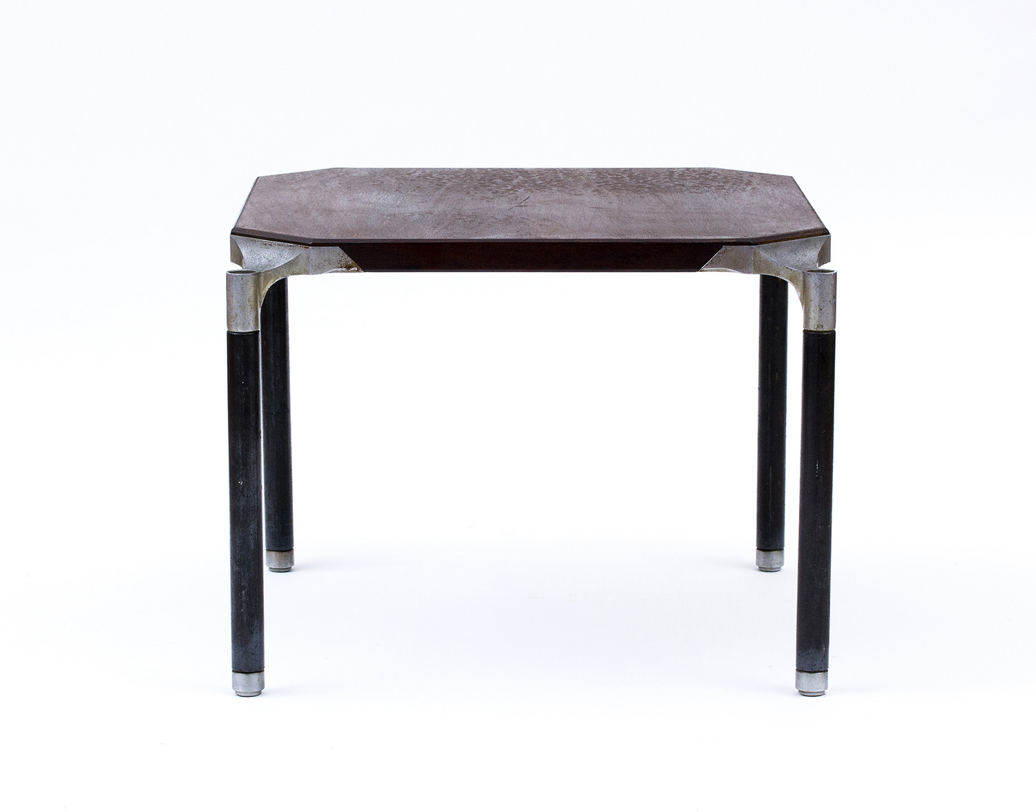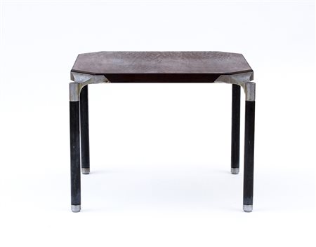 ICO PARISI Tavolino basso “Urio”, 1958 circa Struttura impiallacciata in palissandro, sostegni in metallo lucido e laccato, 35 x 45 x 45 cm Prodotto da MIM, Roma