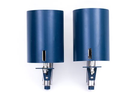 MANIFATTURA ITALIANA Coppia di appliques, anni ‘70 Struttura in metallo cromato e laccato blu, 32 x 15,5 x 19 cm (cada una)