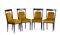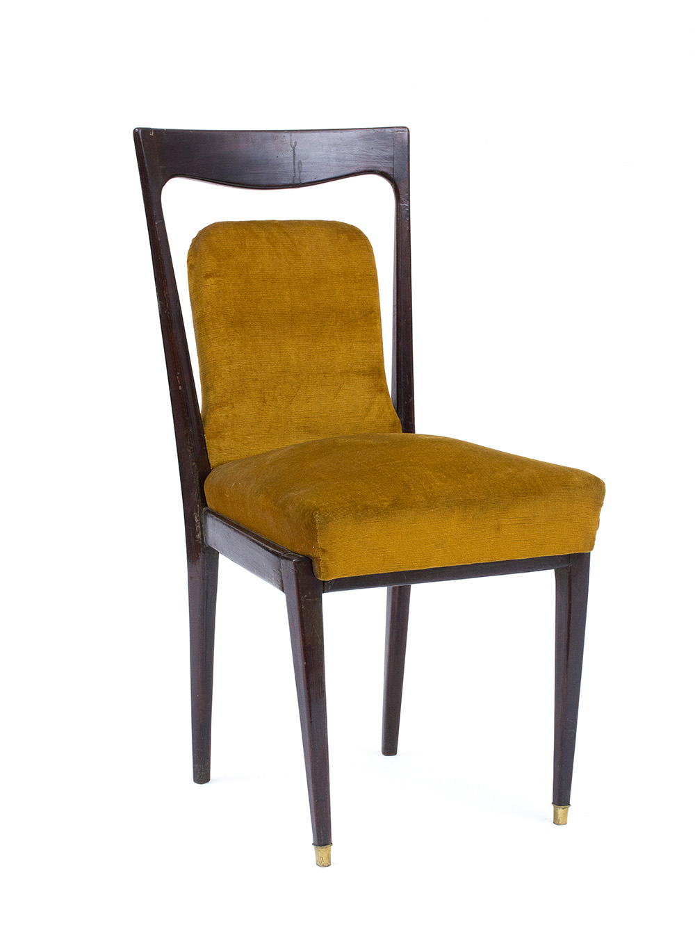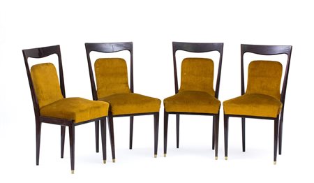 MELCHIORRE BEGA (ATTRIBUITO) Serie di quattro sedie con schienale a giorno e seduta imbottita, fine anni ‘40 Struttura in palissandro, puntali in metallo, rivestimento in velluto color senape, 90 x 47 x 52 cm Un esemplare analogo, ma in acero, è pubblicato in: R. Aloi, Esempi di arredamento moderno. Sedie, poltrone, divani”, Milano 1950, tav. n. 40