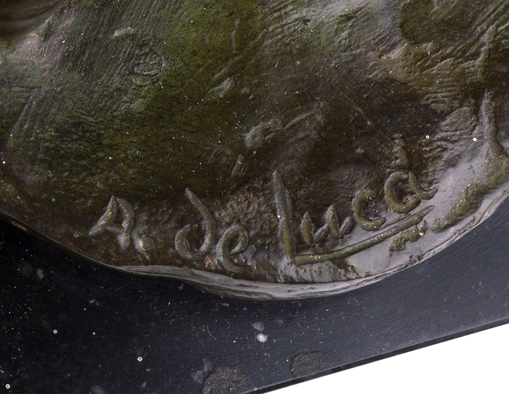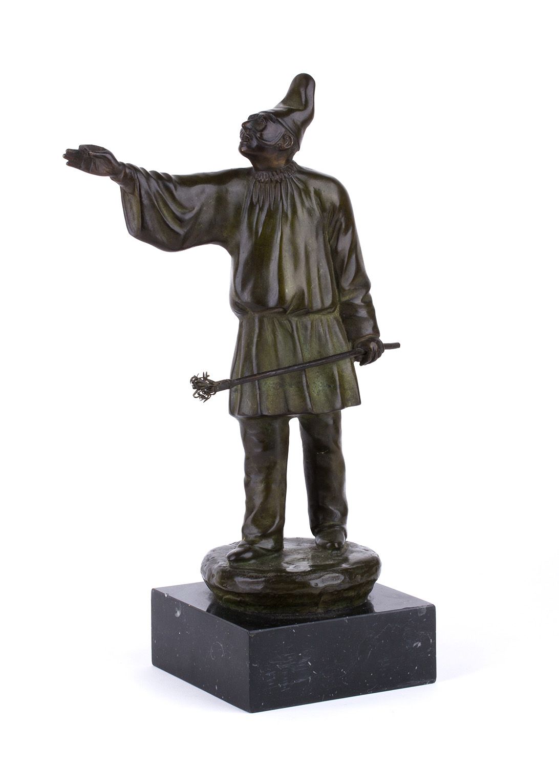 SCULTORE DEL XX SECOLO Pulcinella Scultura in bronzo patinato su base in marmo nero, h. 32,5 cm; 37,5 cm (complessivi) Firma sulla base: A. De Luca