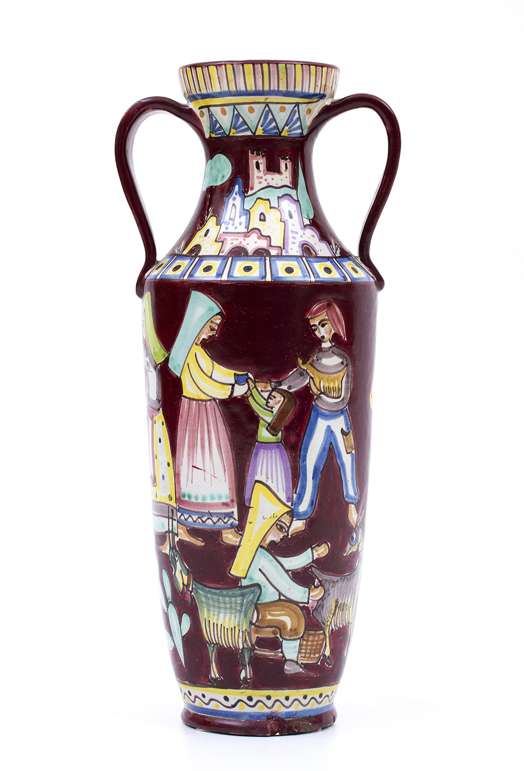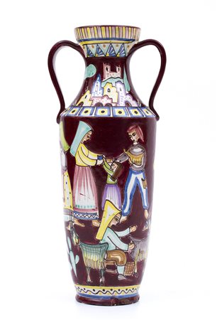 PINTO - VIETRI Grande vaso ad anfora, anni ‘50 Terracotta dipinta con scene contadine in policromia, 49 x 21 x 20 cm Firma sotto la base: V. Pinto Vietri
