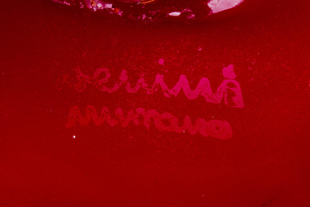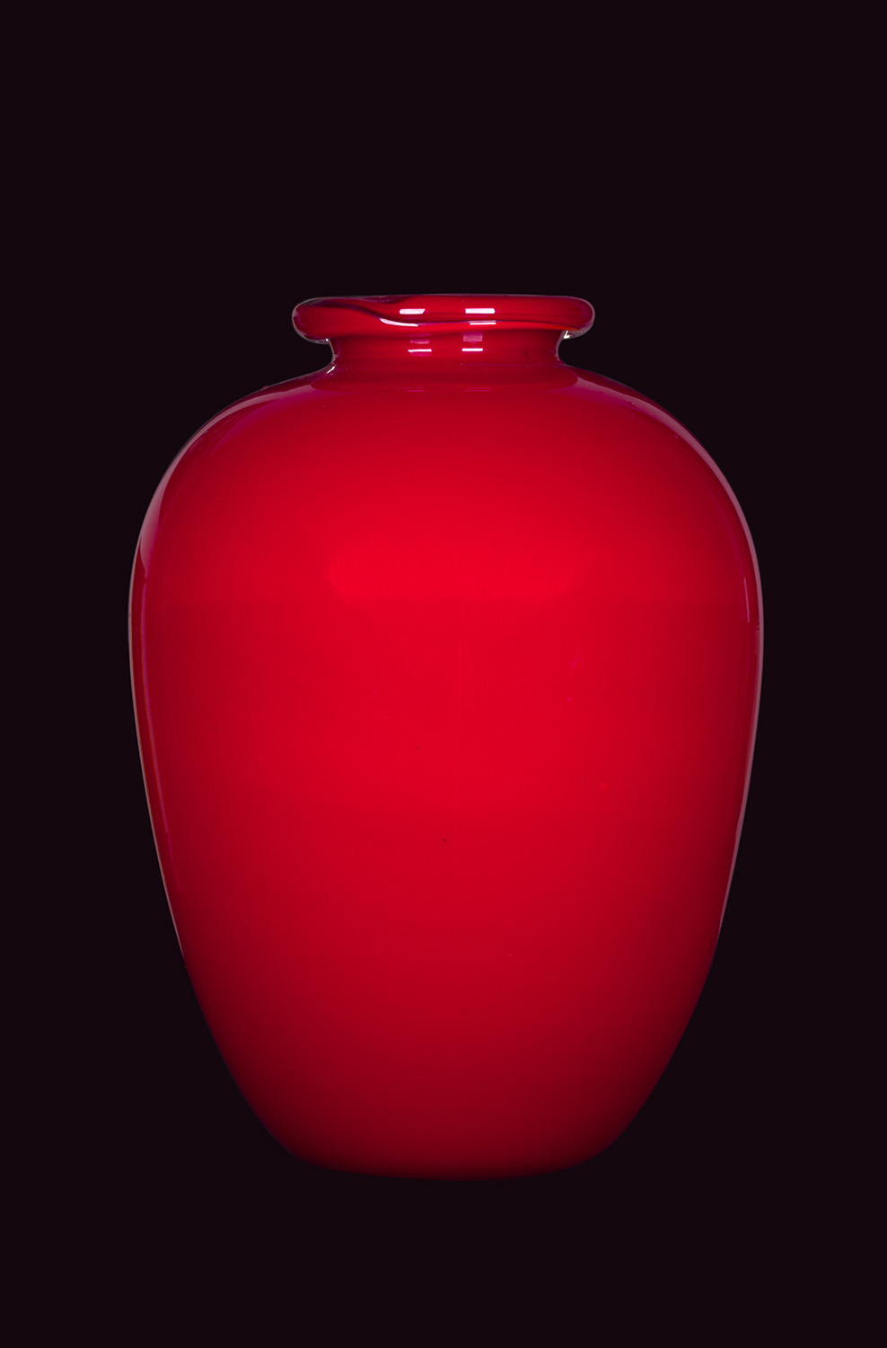 CARLO SCARPA Grande vaso “laccato” rosso, 1940 Vetro rosso della serie “laccati”, h. 30 cm Firma all’acido sotto la base: Venini Murano Il modello di questo vaso è il n.1872, disegnato da Vittorio Zecchin e presente nel catalogo della vetreria fin dagli anni del sodalizio con Cappellin (1921-1925). La serie dei “laccati”, rossi, neri o bicolore nero e rosso, fu presentata per la prima volta alla XXI Biennale di Venezia del 1940. Per ottenere quest’accesa colorazione rossa, Scarpa faceva uso di un particolare tessuto vitreo costituito da minuscole sfere di vetro lavorate a lume inglobate nella massa vetrosa. Data la particolare difficoltà, con questa tecnica sono stati realizzati pochissimi esemplari. Vedi M.Barovier, Carlo Scarpa Venini, Milano 2012, pp.280-287