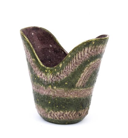 GUIDO GAMBONE Vaso con bocca sagomata e decoro astratto, Anni ‘50 Terracotta...