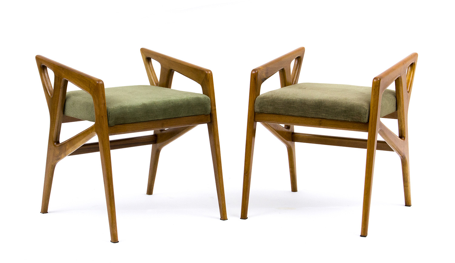 GIO’ PONTI Coppia di sgabelli, anni ‘50 Struttura in noce con seduta imbottita e rivestita in velluto verde, 54 x 44,5 x 46 cm PUBBLICAZIONI 1x – Gio Ponti in Paris. Arredi di design 1930-1970, catalogo della mostra, Galleria DepositoA, Verona / Galleria Regards Sarl, Parigi, maggio-giugno 2012, ill. p.14, scheda p.52
