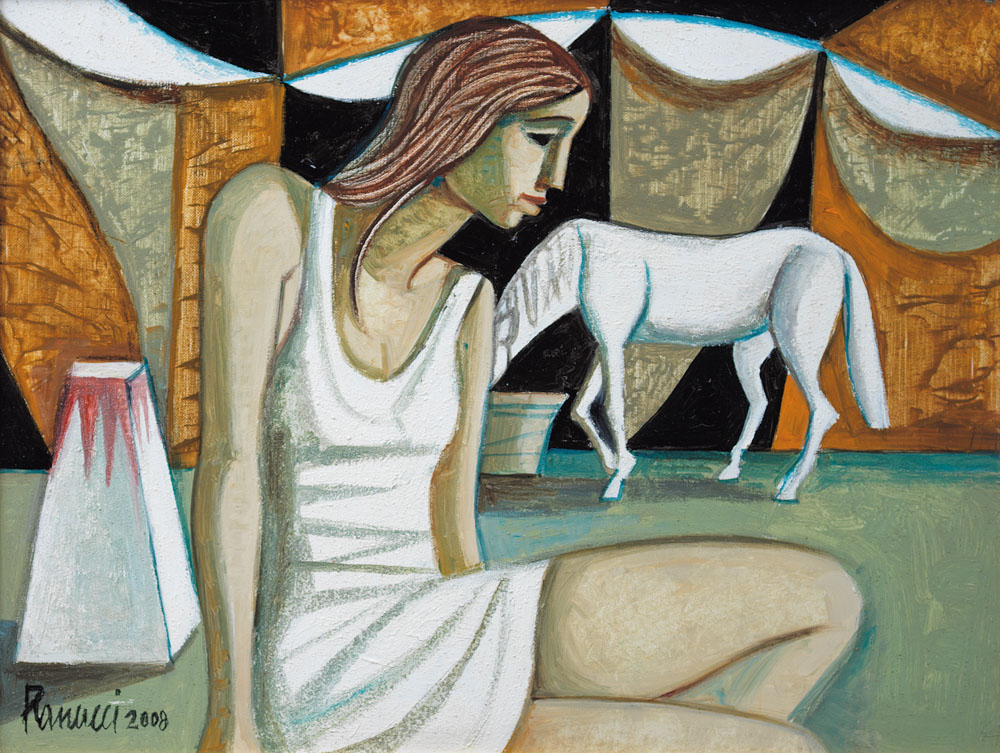 LUCIO RANUCCI Perledo (Co) 1924 Il riposo della giovane cavallerizza, 2008 acrilico su tela cm. 30x40, firma e anno in basso a sinistra, titolo, firma, anno e archivio numero D 413/ I a cura di Renato Alberici Arte Contemporanea al retro, dichiarazione d'autenticità dell'artista e archivio a cura di Renato Alberici Arte Contemporanea su foto.