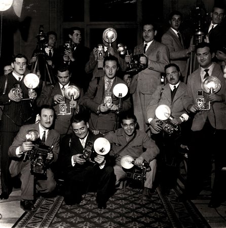 TULLIO FARABOLA Gruppo di fotografi al Quiriale per la formazione del nuovo governo, 17 gennaio 1954 (al centro Tazio Secchiaroli giovanissimo) Vintage, gelatina bromuro d’argento cm. 24x29,5 Sul retro timbro dell’agenzia e didascalia a macchina su un foglietto prestampato della stessa agenzia