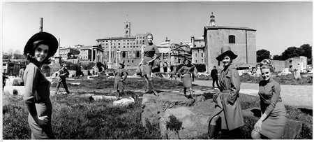 TAZIO SECCHIAROLI Modelle al Foro, anni 60 Vintage, stampa alla gelatina sali d’argento, immagine cm. 15,8x35,8 su foglio 35,8x24 Timbro della casa di moda parigina Monique Valentin Timbro del fotografo