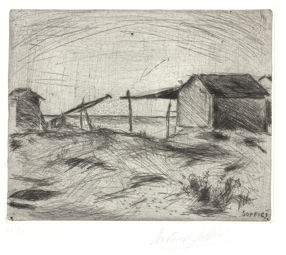 ARDENGO SOFFICI Marina a Forte dei Marmi - Capanno, 1927/28 Puntasecca, es. 12\30, 19 x 23,5 cm lastra; 46 x 63,5 cm foglio Firma in basso a destra: Soffici Tiratura in basso a sinistra