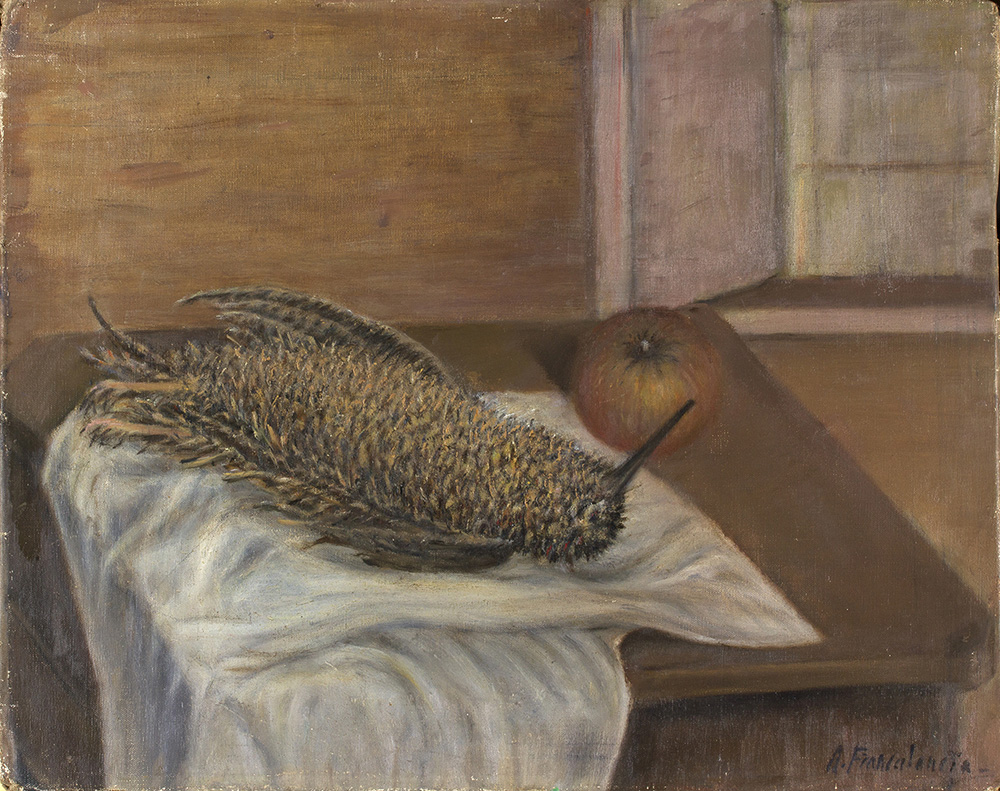 RICCARDO FRANCALANCIA La beccaccia, 1945 Olio su tela, 36 x 45 cm Firma in basso a destra: R. Francalancia Titolo e anno sul retro