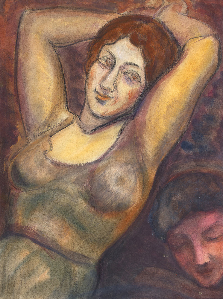 ALBERTO BRAGAGLIA Donna sdraiata Tecnica mista su carta, 38,5 x 29 cm Firma al centro: Alberto Bragaglia Al retro etichetta e timbro Arte Centro, Milano