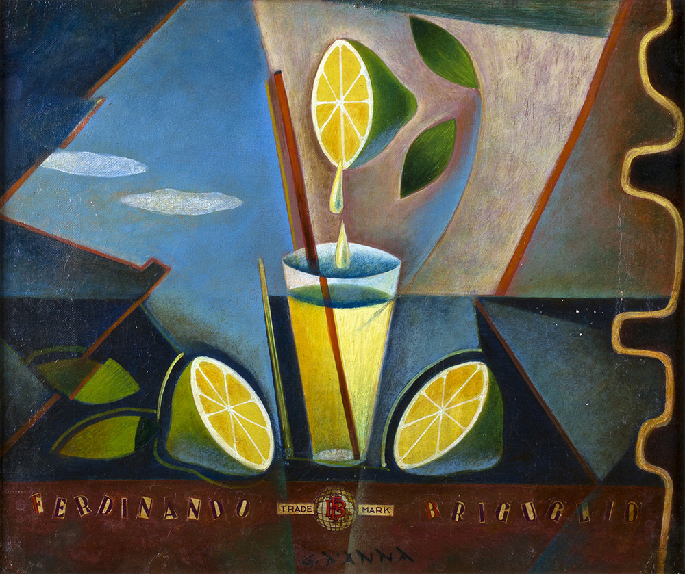 GIULIO D’ANNA Ditta Briguglio, anni ‘40 Olio e collage su tela, 32,5 x 39 cm Firma in basso: Giulio D’Anna Autentiche su foto della Diomedea Arte, Palermo (Archivio Futuristi Siciliani a cura della prof.ssa Ruta) L’opera “Ditta Briguglio” fa parte di una rara serie di dipinti dedicati al noto imprenditore messinese Ferdinando Briguglio, titolare degli “Stabilimenti Briguglio”, un’azienda specializzata nella lavorazione di agrumi che in quel periodo dava lavoro a più di cinquecento famiglie. Oltre ad essere personaggio conosciuto per gli stabilimenti, Briguglio fu anche noto per la spiccata sensibilità nei confronti del mondo artistico, che nel 1948 lo portò a fondare la Briguglio Film, con la quale produsse due film, uno dei quali fu premiato al Festival del Cinema di Venezia. In questo specifico dipinto inoltre è possibile rintracciare richiami del taglio futurista-pubblicitario di Fortunato Depero, fu proprio quest’ultimo a spingere il messinese D’Anna verso la ricerca futurista, a seguito dell’incontro presso la libreria Principato di Messina nel 1926, dove Depero esponeva.