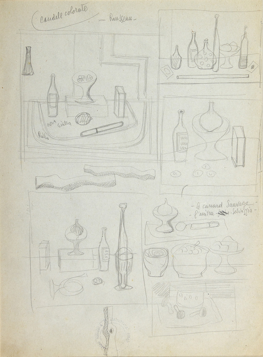ATANASIO SOLDATI Candele colorate - Rosseau Matita su carta, 32 x 21,5 cm Titolo in alto a destra: Candele colorate - Rosseau Al retro uno studio e timbro: Opere inventario Atanasio Soldati