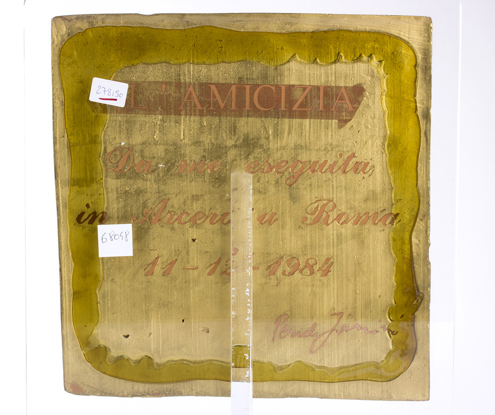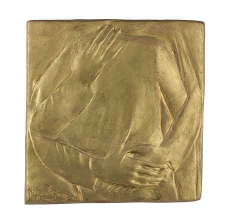PERICLE FAZZINI L’Amicizia, 1984 Bassorilievo in terracotta dipinta, 29,5 x 28,5 x 2 cm Firma e luogo in basso a sinistra: Pericle Fazzini Roma Al retro firma, titolo, anno e luogo: Pericle Fazzini L’Amicizia 1984 Roma