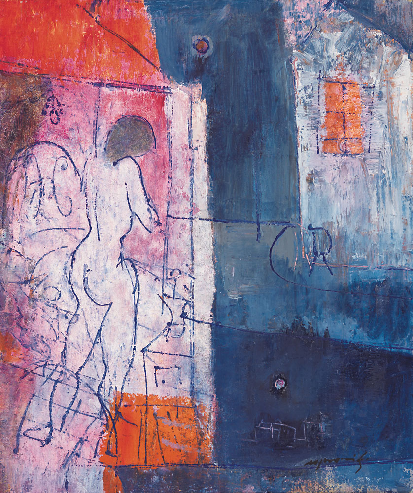 FRANCO ROGNONI Milano 20/09/1913 - Milano 11/03/1999 - Interno esterno, 1992, olio su tela cm. 55x46, firma in basso a destra, firma, titolo e anno al retro, dichiarazione d'autenticità dell'artista con dedica ad personam su foto, pubblicato su Arte Mercato, Editoriale Giorgio Mondadori numero 278 dell'ottobre 1996, pagina 18.