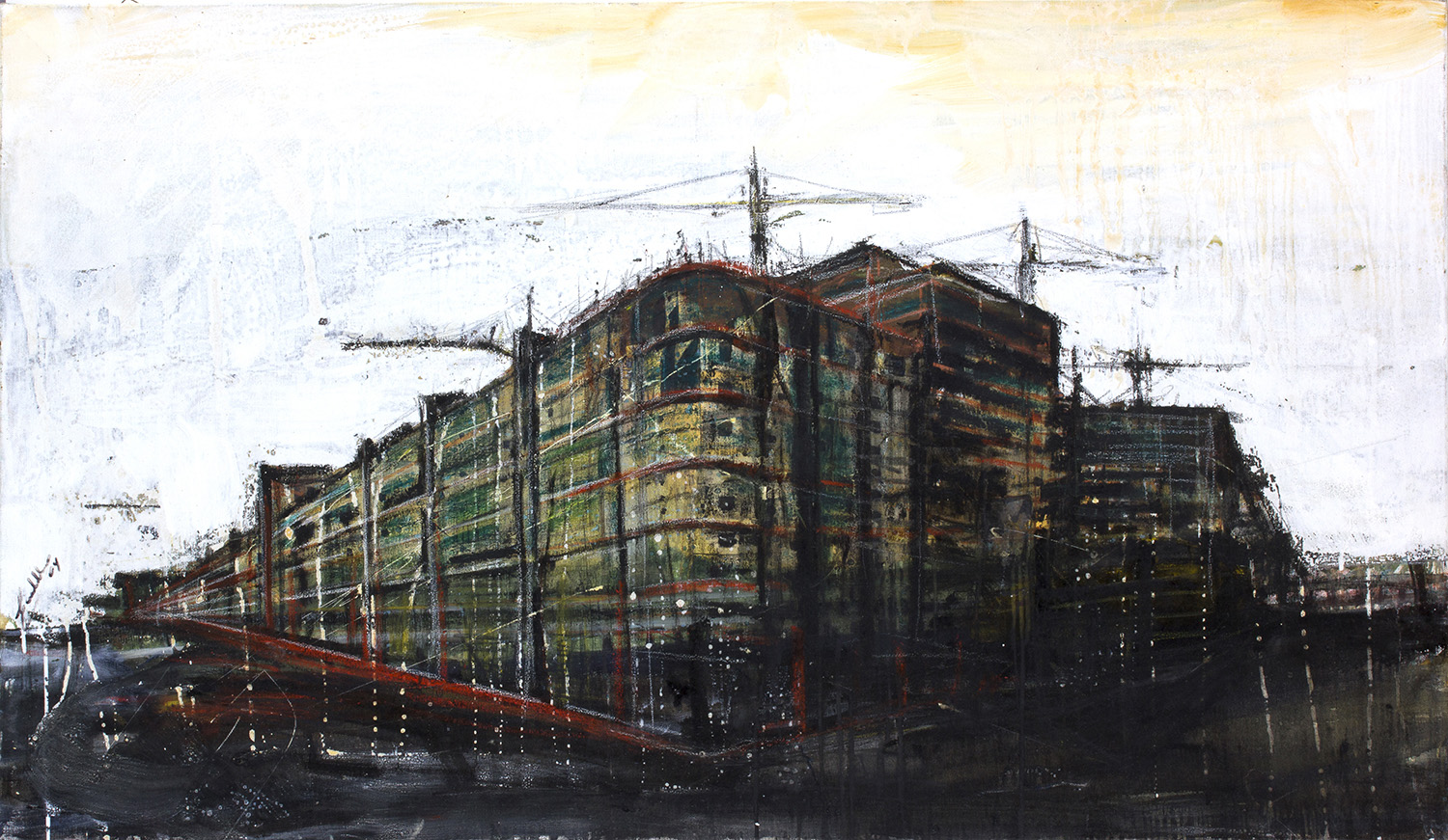 ALFIO SORBELLO Cantieri, 2009 Tecnica mista su tela, 70 x 120 cm Firma, titolo e data al retro: Alfio Sorbello Cantieri 2009 Autentica su foto