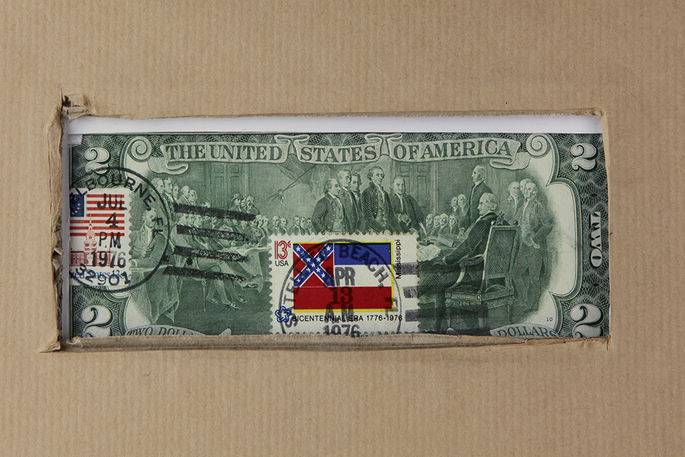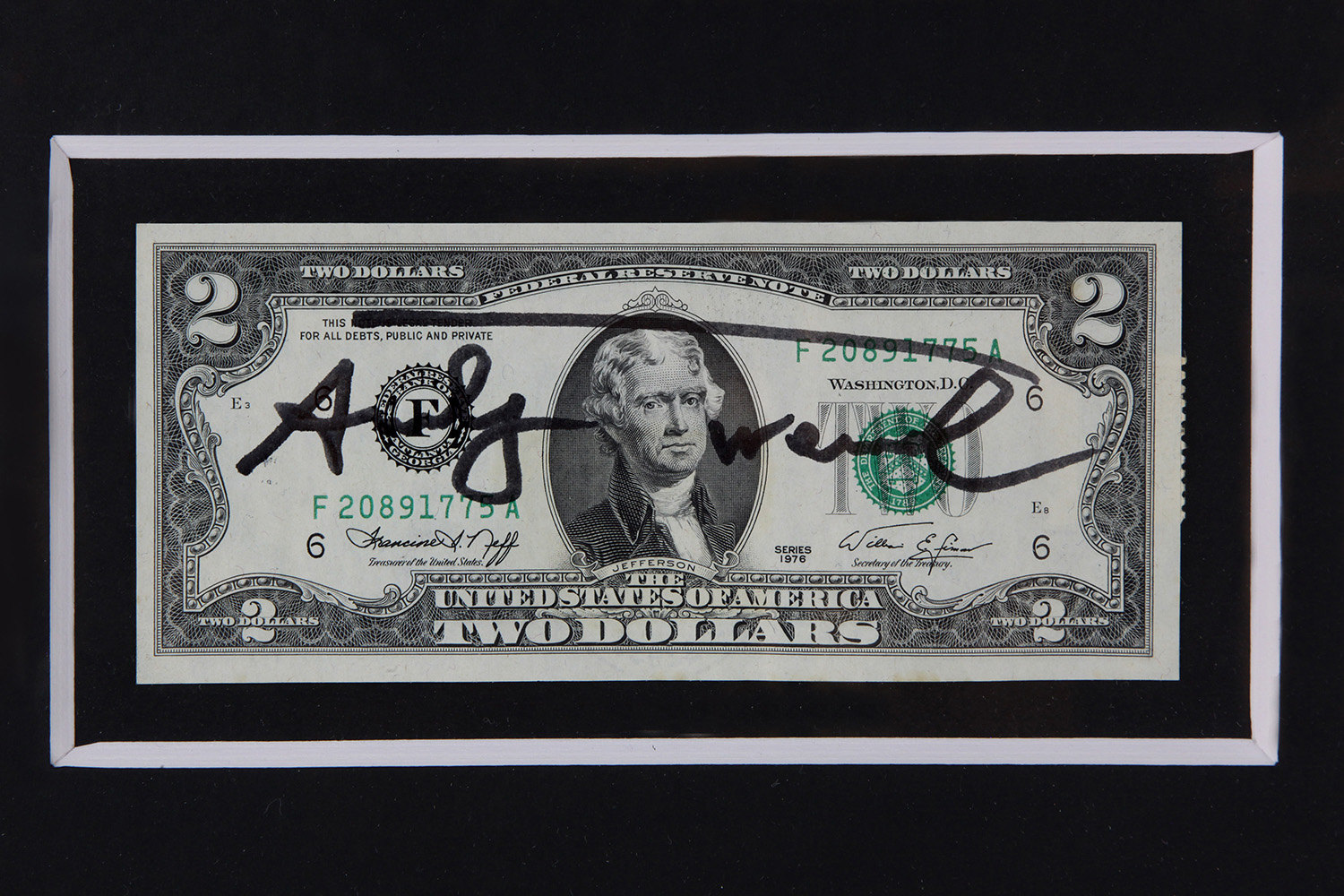 ANDY WARHOL 2 Jefferson’s Dollars, 1976 6,7 x 15,7 cm Opera unica Firma sul fronte con marker nero: Andy Warhol Sul retro due francobolli vidimati 13 aprile e 4 luglio 1976 ESPOSIZIONI E PUBBLICAZIONI Pop Icons, Galleria Restelliartco, 20 Gennaio - 6 Febbraio 2015, Roma, autorizzato da ‘The Andy Warhol Foundation for the Visual Arts, Inc’ by SIAE 2015 I due dollari di Jefferson sono molto rari, reintrodotti nel 1976 e gradualmente usciti fuori circolazione. Andy Warhol li firma e li timbra il 4 luglio 1976, giorno del bicentenario della Dichiarazione d’Indipendenza - 4 Luglio 1776. Il valore del francobollo è di 13 centesimi quanti erano gli stati d’America al momento dell’unione. Il retro dei due dollari raffigura un quadro di Trumbull dei primi dell’800 sulla Dichiarazione d’Indipendenza Americana. Alcuni esemplari sono pubblicati sul catalogo ‘Andy Warhol Vetrine’ di Achille Bonito Oliva - SilvanaEditoriale