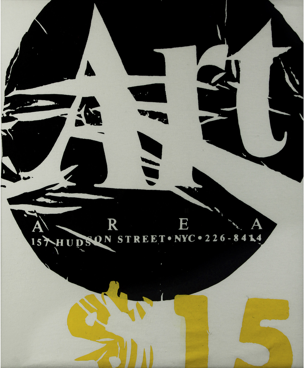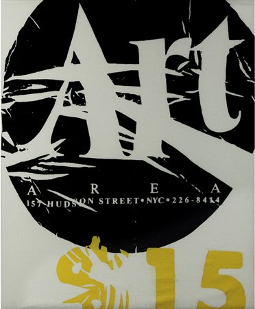 ANDY WARHOL Art $15, 1985 ca Serigrafia a colori su t-shirt in cotone, 53 x 62 cm Opera unica Stampa Rupert Jasen Smith, New York Riferimento al Catalogo Ragionato Feldman e Shellmann N.IIIA.65 ESPOSIZIONI Just Warhol, Ginevra, 19 Marzo - 12 Maggio 2015 Pop Icons, Galleria Restelliartco, Roma, 20 Gennaio - 6 Febbraio 2015 PUBBLICAZIONI Catalogo per l’esposizione Pop Icons, Galleria Restelliartco, Roma, 20 Gennaio - 6 Febbraio 2015, autorizzato da ‘The Andy Warhol Foundation for the Visual Arts, Inc’ by SIAE 2015 PROVENIENZA Collezione privata Realizzata per il club AREA al 157 di Hudson Street a New York Un esemplare e’ pubblicato sul catalogo ‘Andy Warhol Vetrine’ a cura di Achille Bonito Oliva Silvana Editoriale Autentica con timbri della Fondazione Andy Warhol -‘The Estate of Andy Warhol’ e ‘Authorized by the Andy Warhol Foundation for the Visual Arts'