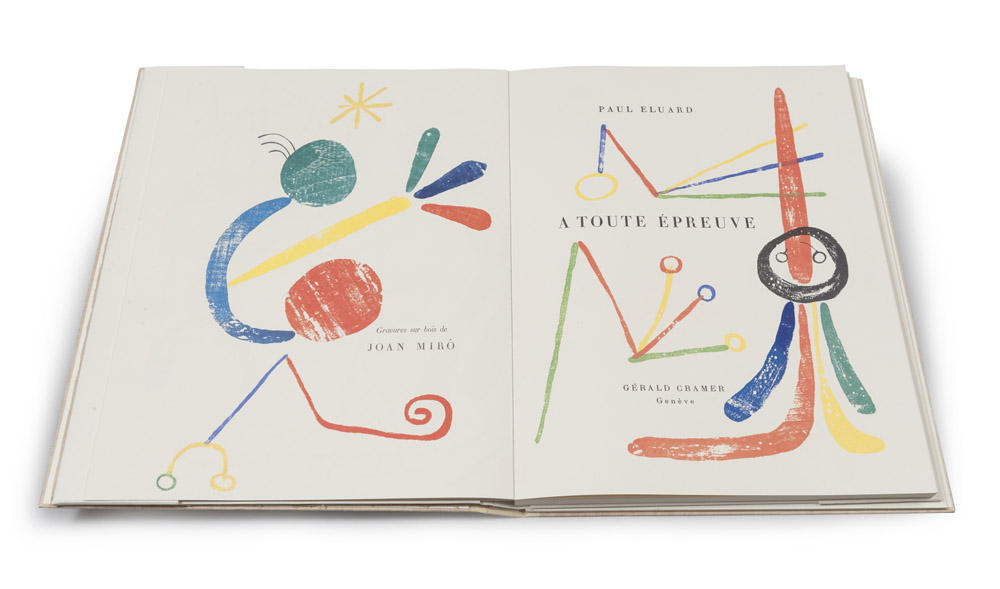 VOLUME J. MIRO', P. ELUARD, A TOUT EPREUVE, 1984 Ristampa in fotolito dell'edizione originale del poema di Eluard illustrato da Mirò con 80 xilografie a colori su Arches e pubblicata nel 1958 in complessivi 130 ex. Editore G. Cramer, Ginevra 1984 + prove di stampa su Arches di 3 xilografie originali del libro corrispondenti ai numeri 31, 31 e 80 del catalogo citato.