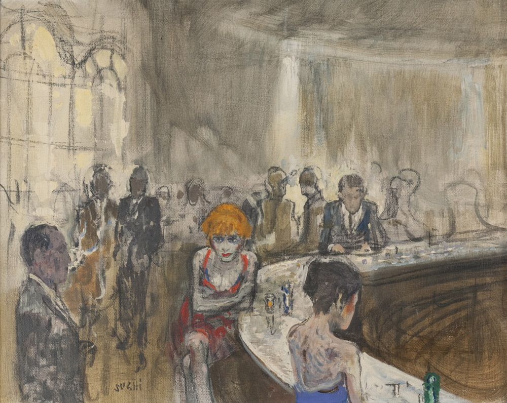 ALBERTO SUGHI (Cesena 1928 - Bologna 2012) Figure al bar, 1989 Olio su tela, cm. 40 x 50 Firma in basso a sinistra Firma e timbri al retro PROVENIENZA Galleria d'arte Parametro, Roma Collezione privata, Roma Autentica su foto dell'Artista