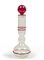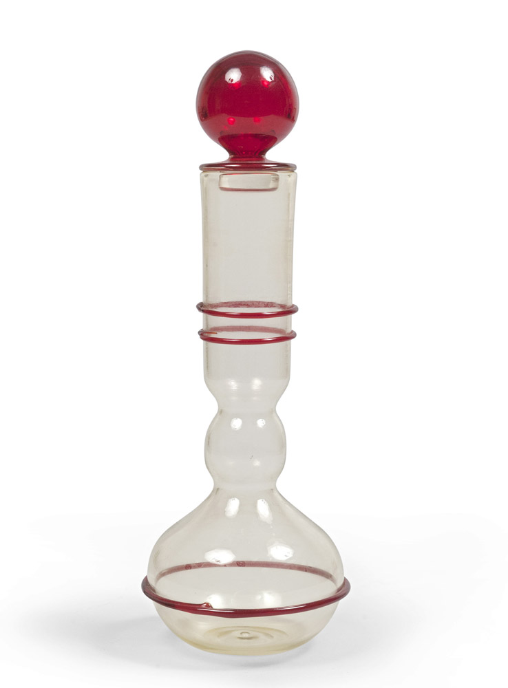 BOTTIGLIA IN VETRO DI MURANO TIPO MEMPHIS in vetro giallo e applicazioni a caldo di vetro rosso, con tappo. Misure, cm. 33 x 10