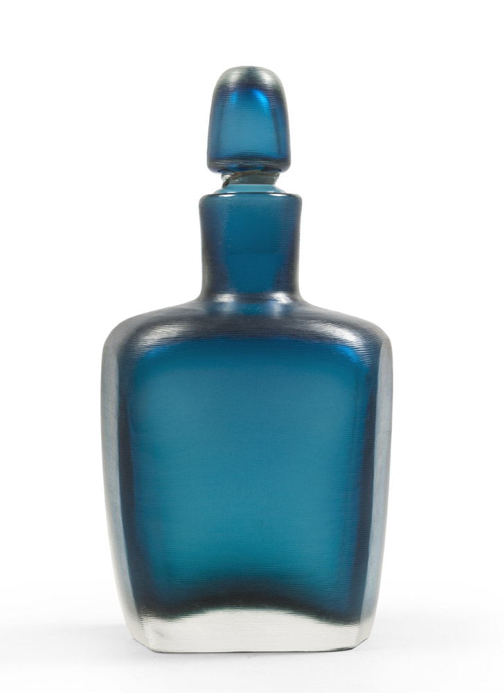 PAOLO VENINI (Milano 1895 - Venezia 1959) Mod. 722-23, 1956 ca. Bottiglia con tappo in vetro composto, soffiata e lavorata a mano, successivamente incisa alla mola nella colorazione del blu. Misure, cm. 22 x 9,5 x 6 Timbro all'acido alla base Il tappo presenta punti di restauro.