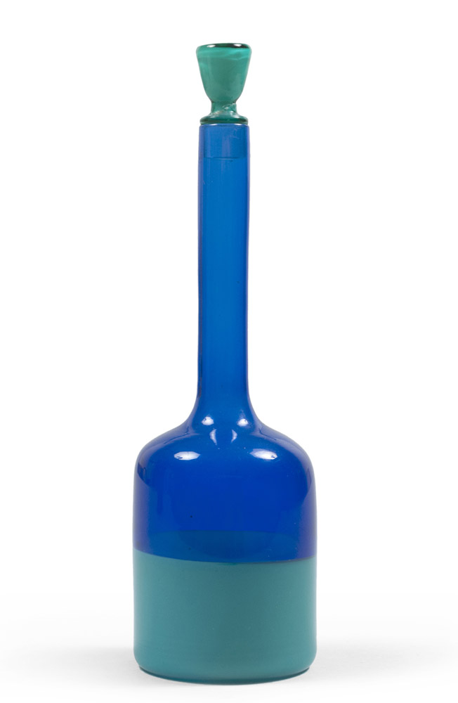 FULVIO BIANCONI (Padova 1915 - Milano 1996) Bottiglia con collo allungato e tappo della serie a fasce orizzontali. Venini, Murano 1953-56 ca. Vetro soffiato trasparente verde con fasce orizzontali blu e azzurro. Misure, cm. 21 x 6. Firma all'acido sotto la base. Buono stato di conservazione