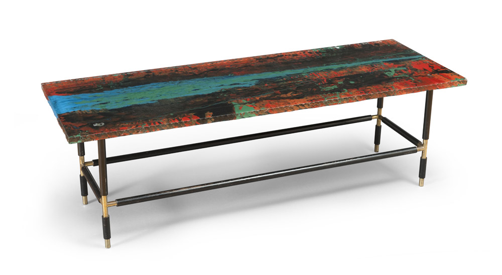 DUILIO BARNABE' (Bologna 1914 - 1961) E MAX INGRAND att.o (Bressuire 1908 - Parigi 1969) Tavolinetto, anni '50 Ripiano in vetro policromo e base in metallo Misure, cm. 38,5 x 120,5 x 45 Produzione Fontana Arte