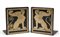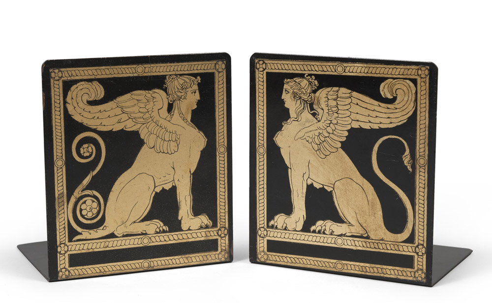PIERO FORNASETTI (Milano 1913 - 1988) Coppia di reggilibri 'Sfingi', anni '60 Lamiera serigrafata oro su nero, cm. 15 x 13,5 x 10 Etichette della manifattura sotto le basi