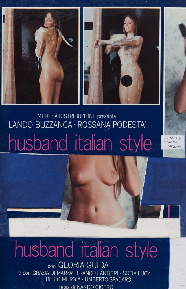 HUSBAND ITALIAN STYLE - IL GATTO MAMMONE Bozzetto per la brochure del film del 1975 diretto da Nando Cicero con Rossana Podestà, Gloria Guida, Lando Buzzanca, Umberto Spadaro Tecnica mista e collage, cm. 36,5 x 30 PROVENIENZA Collezione Società Adriana Chiesa Enterprises, Roma