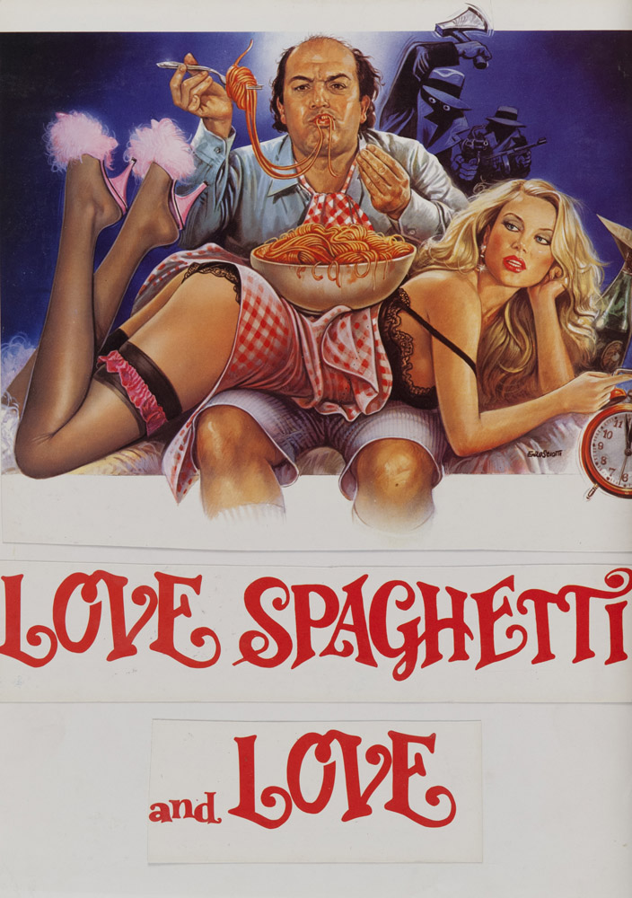 SPAGHETTI A MEZZANOTTE - LOVE SPAGHETTI & LOVE Bozzetto della locandina del film del 1981 film di Sergio Martino con Barbara Bouchet, Lino Banfi, Teo Teocoli, Daniele Vargas Collage su cartoncino, cm. 42 x 30 PROVENIENZA Collezione Società Adriana Chiesa Enterprises, Roma