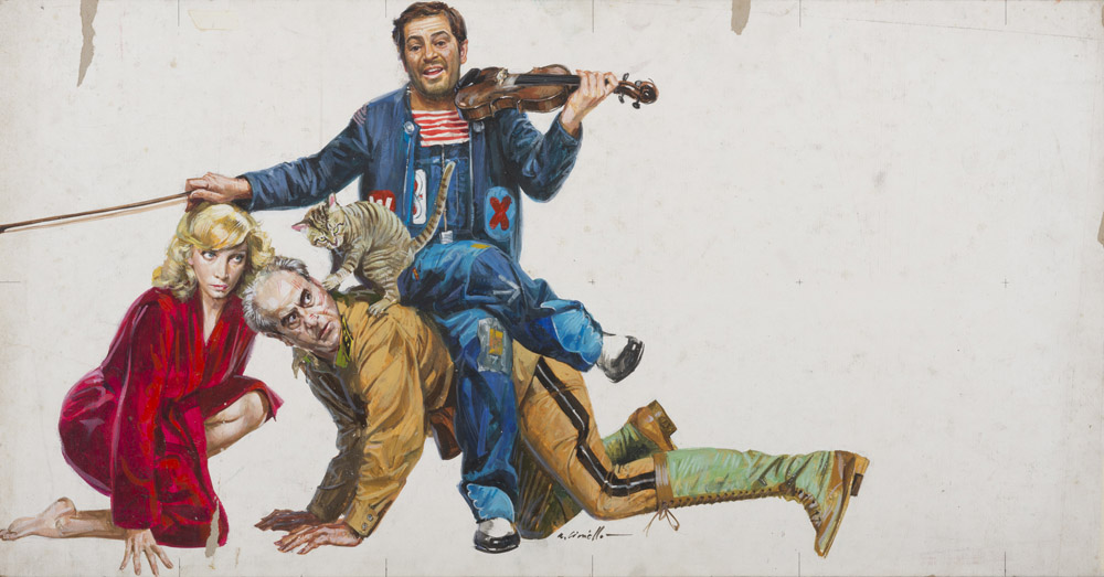 AVERARDO CIRIELLO (Milano 1918) ATTENTI AL BUFFONE Bozzetto per il manifesto del film del 1975 diretto da Alberto Bevilacqua con Nino Manfredi, Mariangela Melato, Eli Wallach, Enzo Cannavale Tecnica mista su cartoncino, cm. 55 x 38,5 Firma in basso a destra PROVENIENZA Collezione Società Adriana Chiesa Enterprises, Roma