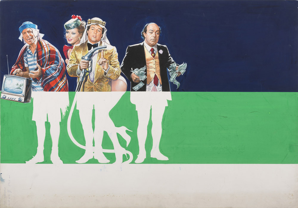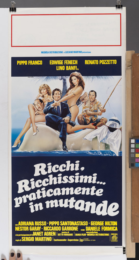 RENATO CASARO (Treviso 1935) RICCHI, RICCHISSIMI, PRATICAMENTE IN MUTANDE Bozzetto e locandina del film comico del 1982 diretto da Sergio Martino con Edwige Fenech, Pippo Franco, Renato Pozzetto e Lino Banfi Acquarello su cartoncino, cm. 51 x 73 Stampa, cm. 33,5 x 68,5 PROVENIENZA Collezione Società Adriana Chiesa Enterprises, Roma