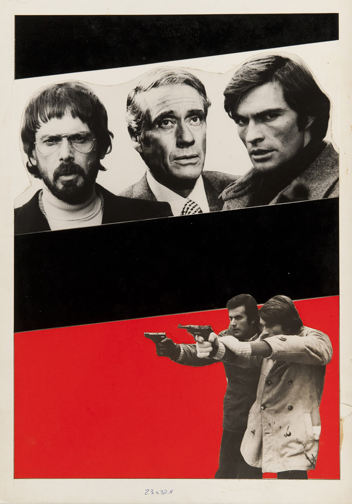 LA POLIZIA ACCUSA: IL SERVIZIO SEGRETO UCCIDE Due bozzetti per il manifesto del film del 1975 diretto da Sergio Martino con Tomas Milian, Luc Merenda, Delia Boccardo Collage fotografico, cm. 42 x 30,5 Tecnica mista, collage e ritaglio fotografico, cm. 42,5 x 30 PROVENIENZA Collezione Società Adriana Chiesa Enterprises, Roma