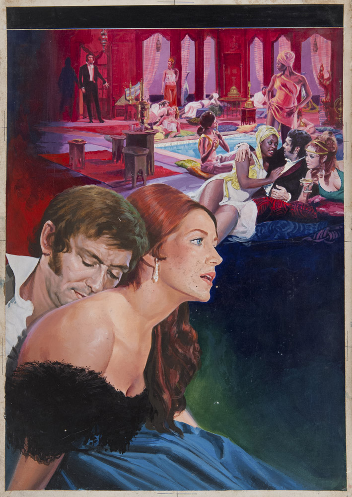 LE NOTTI BOCCACCESCHE DI UN LIBERTINO E DI UNA CANDIDA PROSTITUTA Bozzetto per il manifesto del film del 1971 diretto da Michel Deville con Maurice Ronet e Françoise Fabian Tempera e collage su cartoncino, cm. 69 x 49 PROVENIENZA Collezione Società Adriana Chiesa Enterprises, Roma