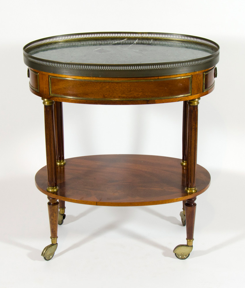 Tavolino con cassetti, piano in marmo e bordo in ottone, su ruote.
