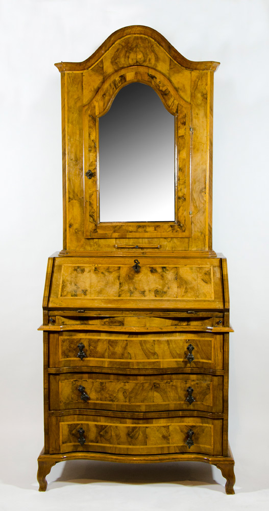 Lot 85 | Trumeau in legno a doppio corpo con anta a specchio, calatoia e 3 cassetti....