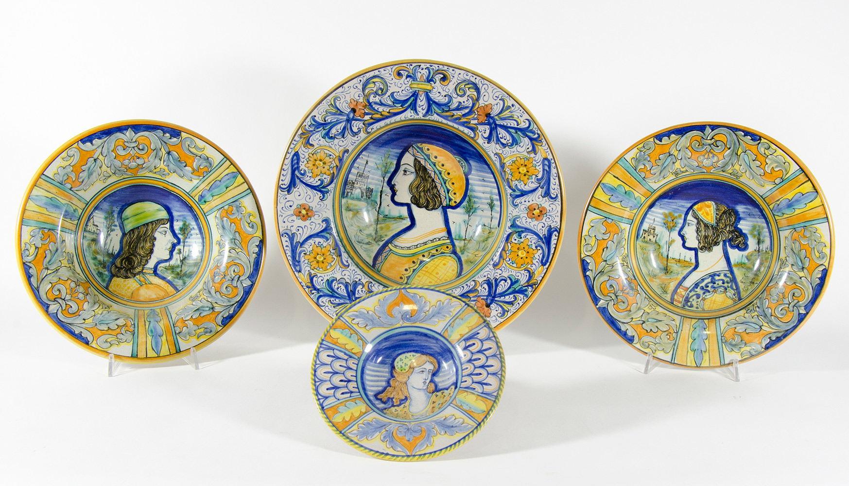 Lotto di 4 piatti in ceramica policroma con decori floreali. Misure diverse.